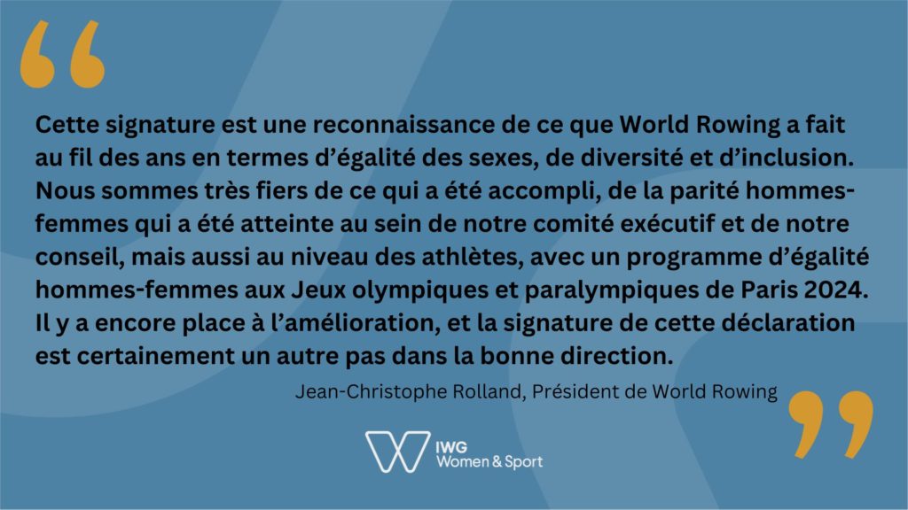 Jean-Christophe Rolland, président de World Rowing, a déclaré : « Cette signature est une reconnaissance de ce que World Rowing a fait au fil des ans en termes d’égalité des sexes, de diversité et d’inclusion. Nous sommes très fiers de ce qui a été accompli, de la parité hommes-femmes qui a été atteinte au sein de notre comité exécutif et de notre conseil, mais aussi au niveau des athlètes, avec un programme d’égalité hommes-femmes aux Jeux olympiques et paralympiques de Paris 2024. Il y a encore place à l’amélioration, et la signature de cette déclaration est certainement un autre pas dans la bonne direction.”
