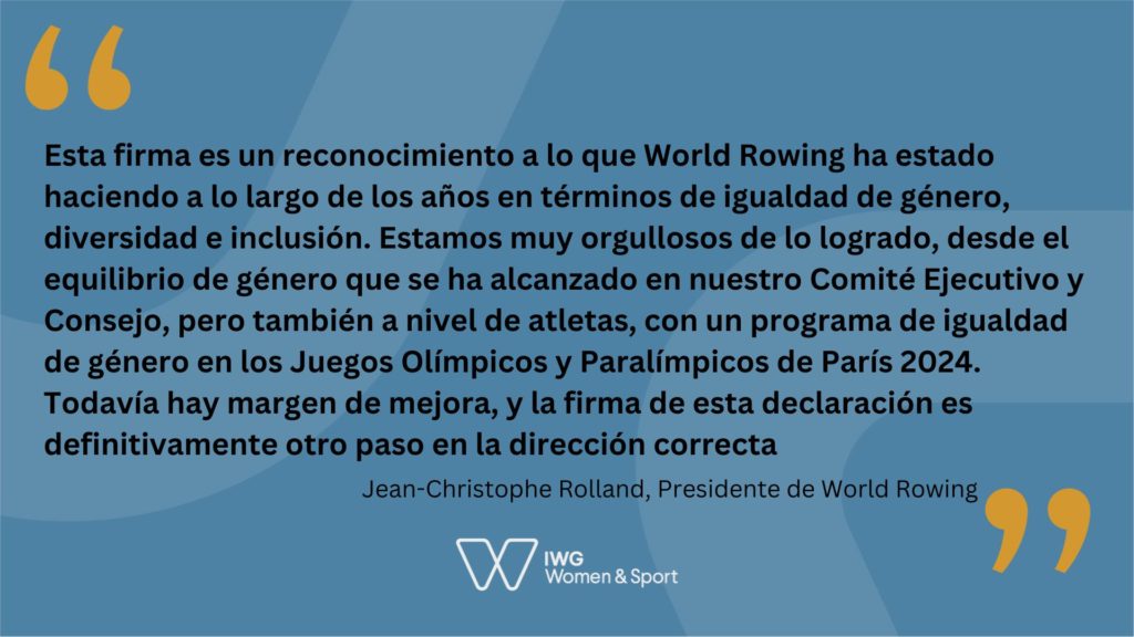 Jean-Christophe Rolland, presidente de World Rowing, dijo: “Esta firma es un reconocimiento a lo que World Rowing ha estado haciendo a lo largo de los años en términos de igualdad de género, diversidad e inclusión. Estamos muy orgullosos de lo logrado, desde el equilibrio de género que se ha alcanzado en nuestro Comité Ejecutivo y Consejo, pero también a nivel de atletas, con un programa de igualdad de género en los Juegos Olímpicos y Paralímpicos de París 2024. Todavía hay margen de mejora, y la firma de esta declaración es definitivamente otro paso en la dirección correcta”.