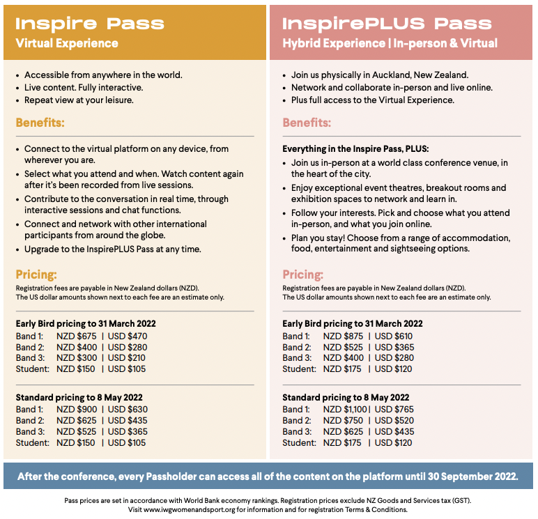 For the first time in its 28-year history, the IWG World Conference on Women & Sport will take place as an in-person/virtual and a virtual-only format. Two registration types are already available to buy: