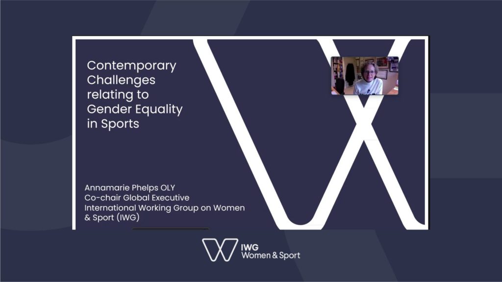 Annamarie concluded the webinar by speaking on the ‘Contemporary challenges relating to gender equality in sport’, where her message reinforced that of the Strategic Plan of the IWG by placing focus on the need to fix the sport system and not the women themselves. She highlighted the importance of Government to implement policies to support women’s sport, along with five key themes of Participation, Leadership, Resources, Portrayal and Leadership.